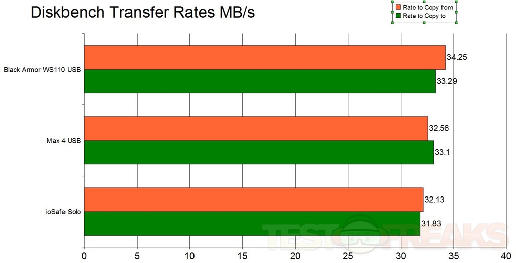 The first test is SiSoft Sandra 2009 SP3 Removable Storage Benchmark, here I compared both USB and eSATA of the Max 4 to the Black Armor WS110 and the ioSafe Solo drive. It should be noted that the drive I used is the same 500gb drive that survived the ioSafe drowning.