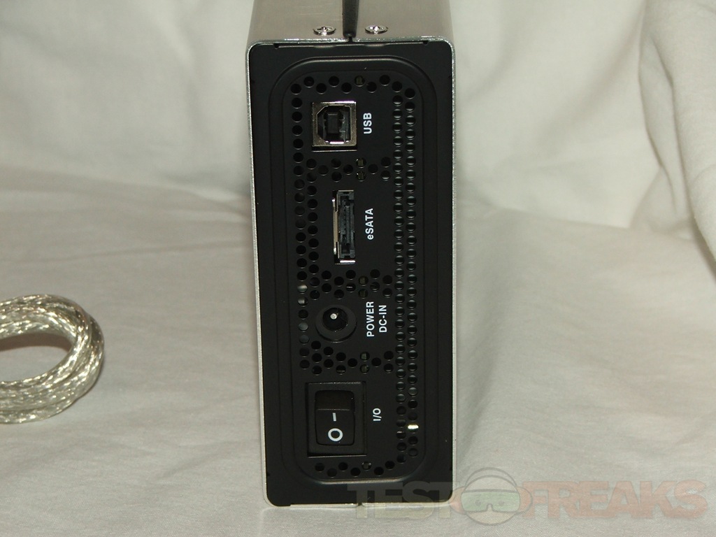 On the back is where you’ll find the connections for eSATA, USB and power along with the main power switch as well and more ventilation holes.