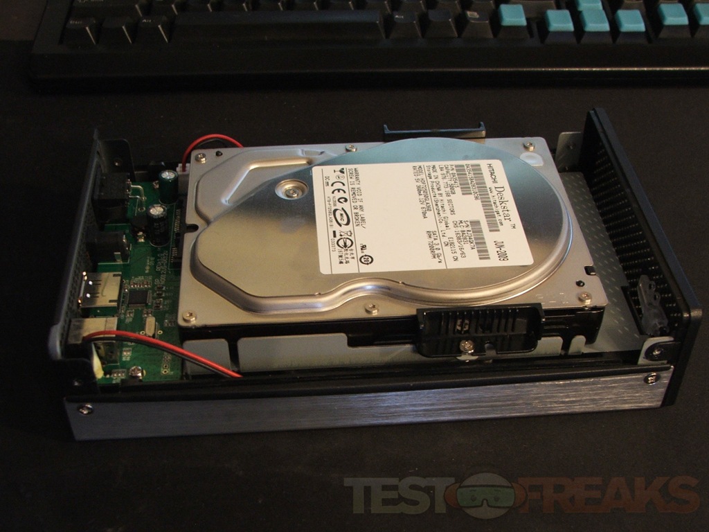 You’ll need to remove four screws to get inside of the Max 4, taking cover off reveals the PCB, fan and hard drive cage. You don’t actually secure the hard drive itself in the Max 4, instead there are two black pieces of plastic that act as rails, these have two pins in them that correspond to the holes in the HDD, then they get secured to the Max 4.