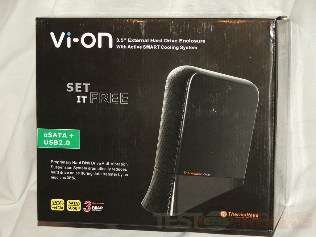 About one week ago I took a look at the Thermaltake Max 4 USB and eSATA external hard drive, and I found it was a decent product. Today for review I’ve got another Thermaltake External Hard Drive Enclosure called the Vi-on. This one is very different from the Max 4 in style, and looks, it’s very sleek and sort of artsy looking, it does feature both USB and eSATA connections and a separate, removable base. The Vi-on is also partially tool-less for the installation, and the hard drive rests on springs to help dampen vibrations while the entire enclosure is cooled by a small, silent fan. I’ve put compared it to several others I’ve got on hand, read on to find out the results…