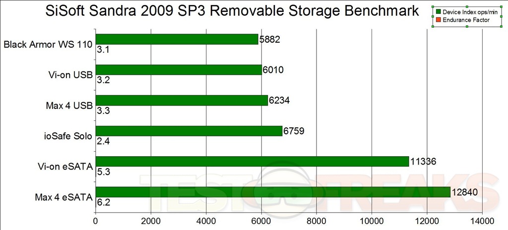 First up I’ve got testing with both USB and eSATA connections of the Vi-on using SiSoft Sandra 2009 SP3 Removable Storage benchmark and compared to a few others I’ve got on hand. The same Hitachi 500gb hard drive is used in the ioSafe Solo, Max 4 and the Vi-on enclosures.
