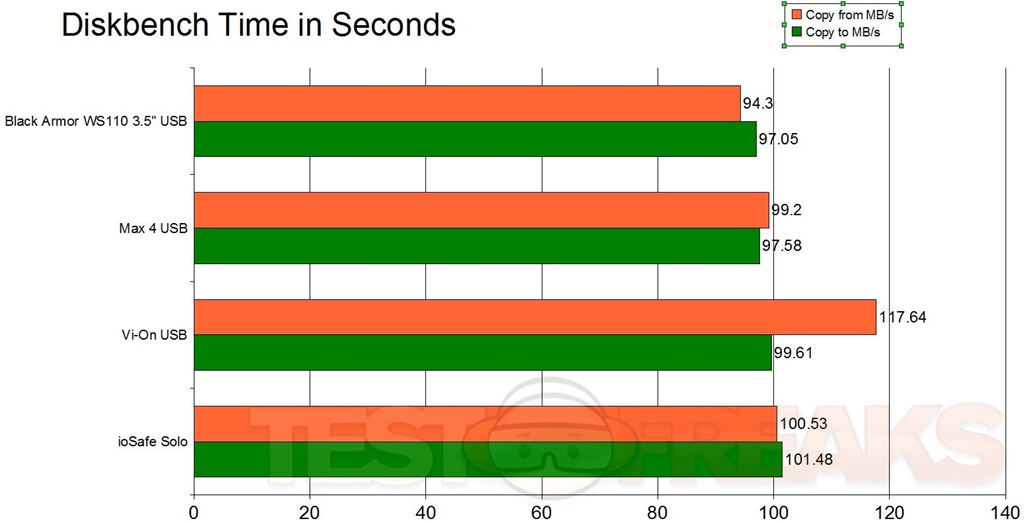 For the next test I’ve got DiskBench and the time it takes to Copy to or Write a file and Copy From the enclosures. I didn’t include eSATA scores as we already know it will win out, only SB scores are included as that’s the most common interface.