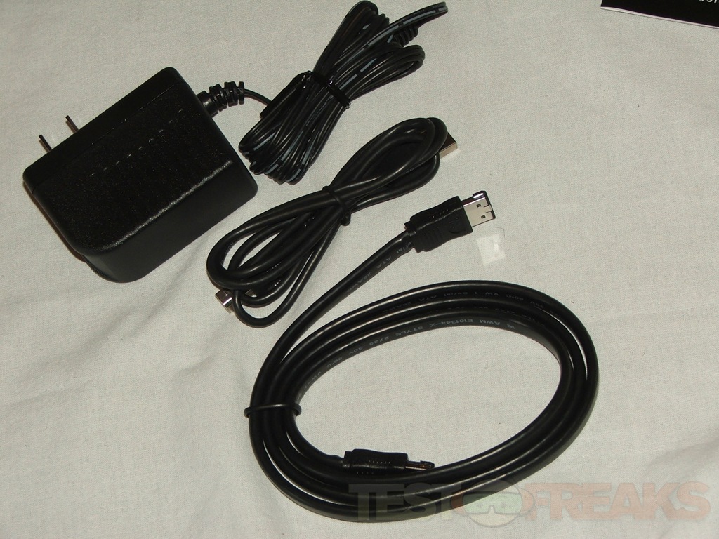 Getting everything unpacked we find the enclosure, cleaning cloth, USB cable, eSATA cable, power supply, stand, and user manual. The stand is a wedge shape and has a cut out in it where the fan is located on the enclosure itself.