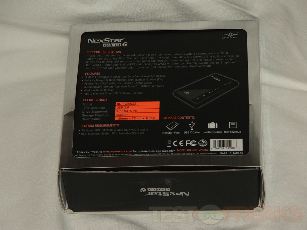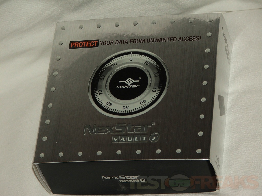 The package for the NexStar Vault is really two boxes, or a box and a slip cover. The slipcover is a metallic silver with a front meant to look like a safe or vault. On the back you’ll find specs and features listed.