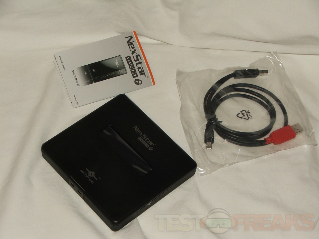 Inside the box we find a plastic case, user manual and a double ended USB cable. The USB cable has two regular USB connections on it and a mini-USB connection for the enclosure itself. The USB connections are color coded, one black for data the other red for additional power if needed by the unit.