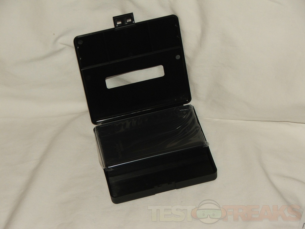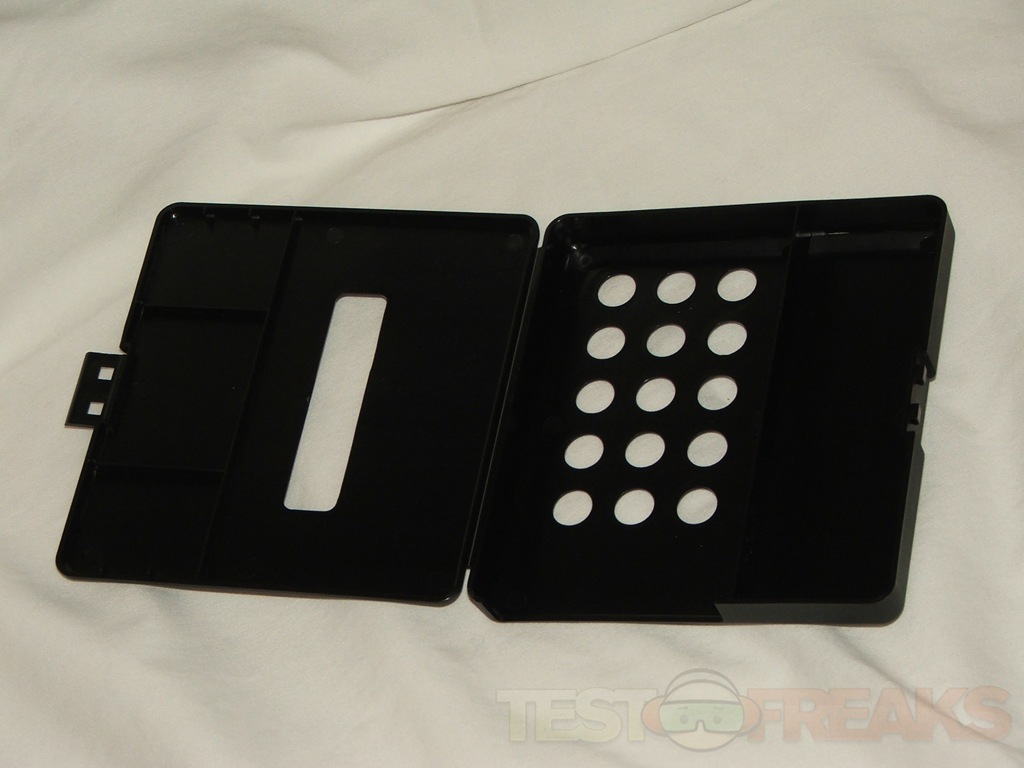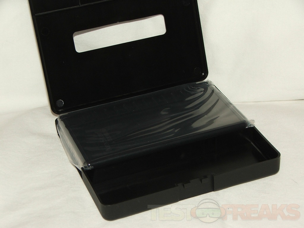 We find the Vault inside of the plastic carrying case wrapped in a plastic bag. The carrying case has a small section in it for the USB cable to be stored, ventilation holes on the bottom and a cutout section on one side so you can access the enclosure while it’s in the carrying case.