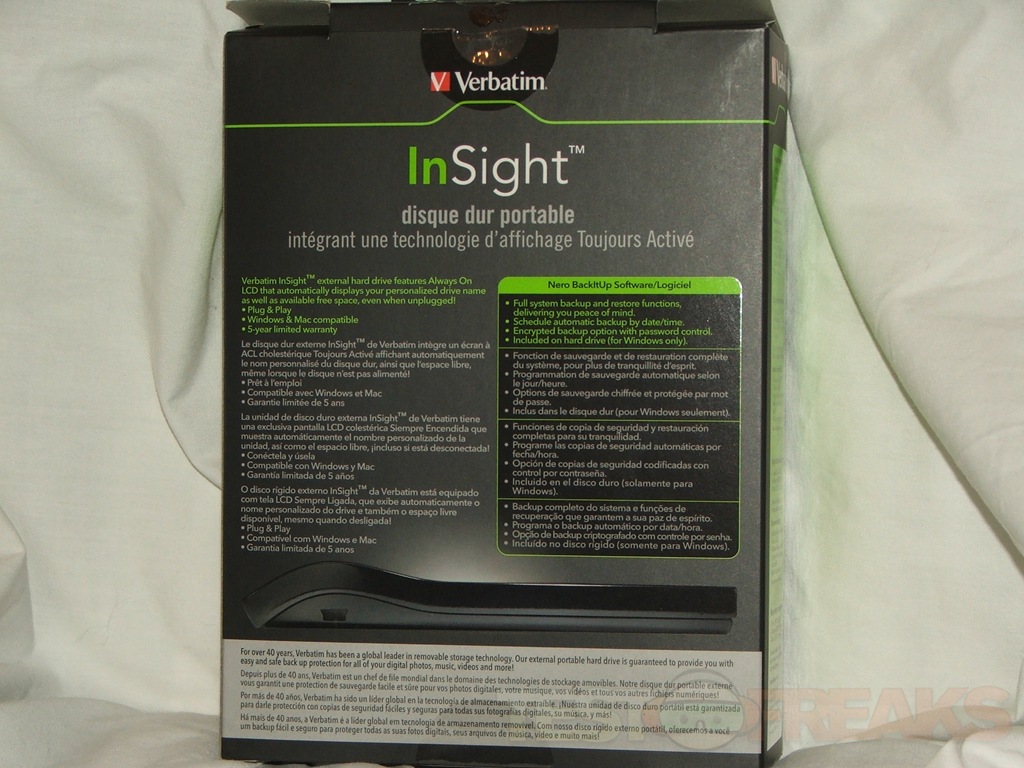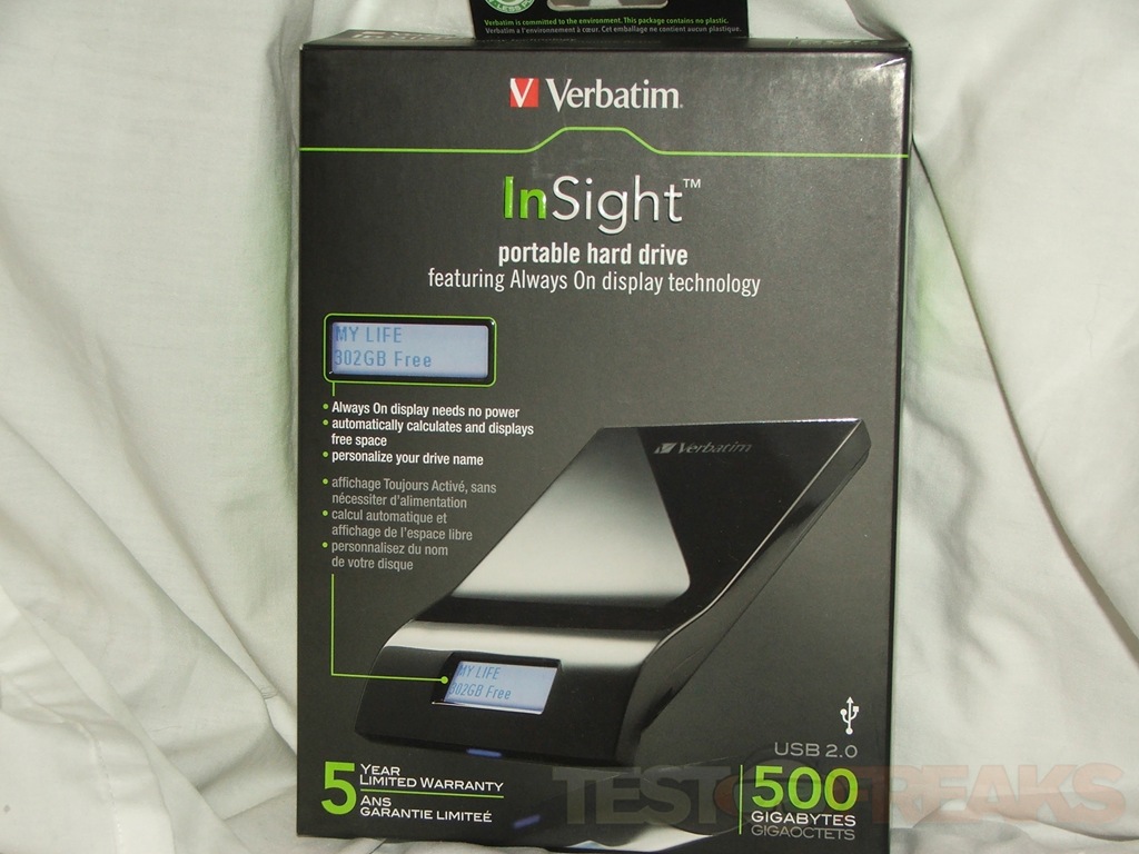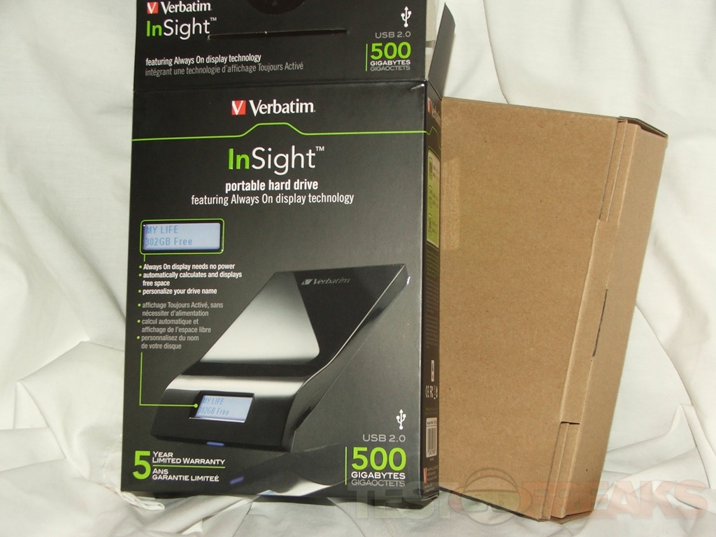 The Verbatim InSight comes in two boxes actually, one is the outside cover with the information while the other inside houses the drive, manual and USB cable.