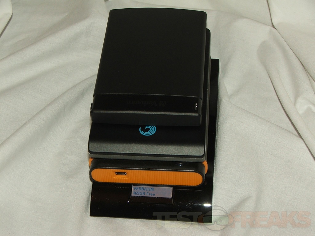 Here’s the InSight with the Seagate BlackArmor, Transcend StoreJet and the Verbatim Clon drive. The InSight is the largest of the bunch in regards to length, but it’s fairly thin.