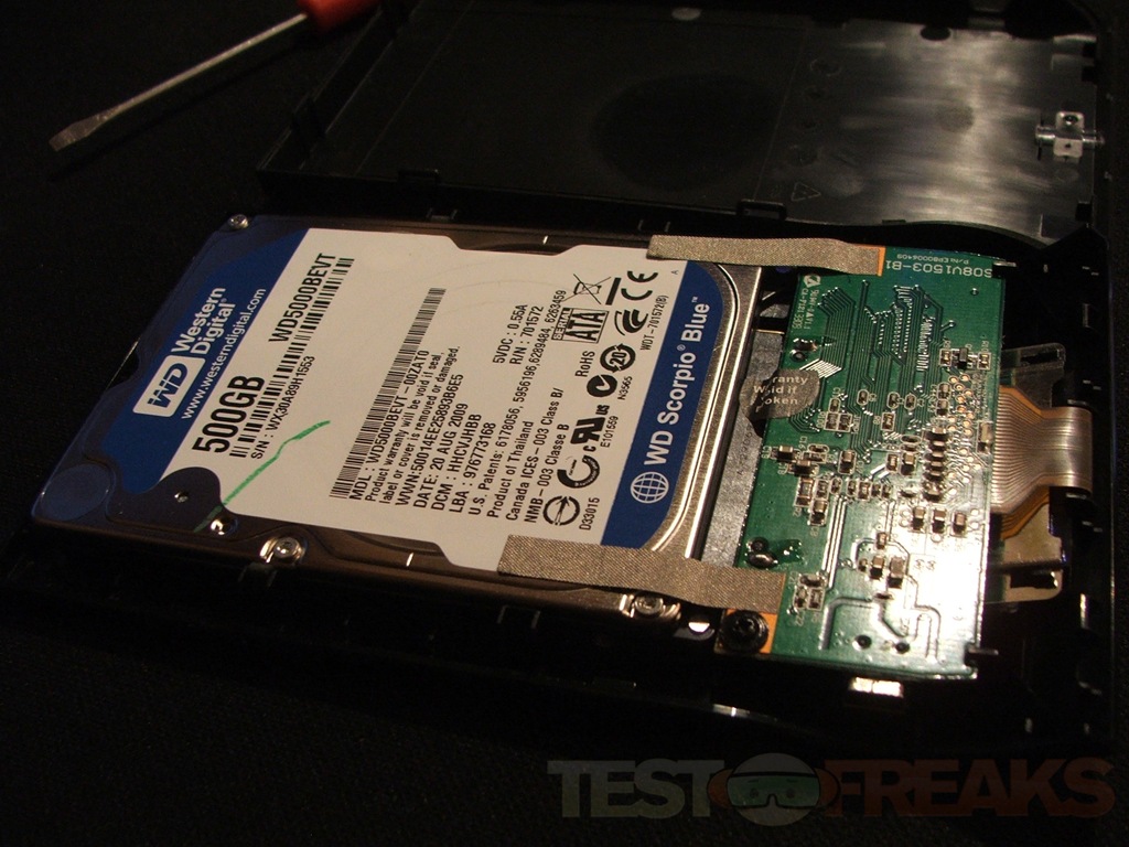 Of course I had to open it up to see what was inside, and I found a Western Digital Scorpio Blue 500GB SATA hard drive.