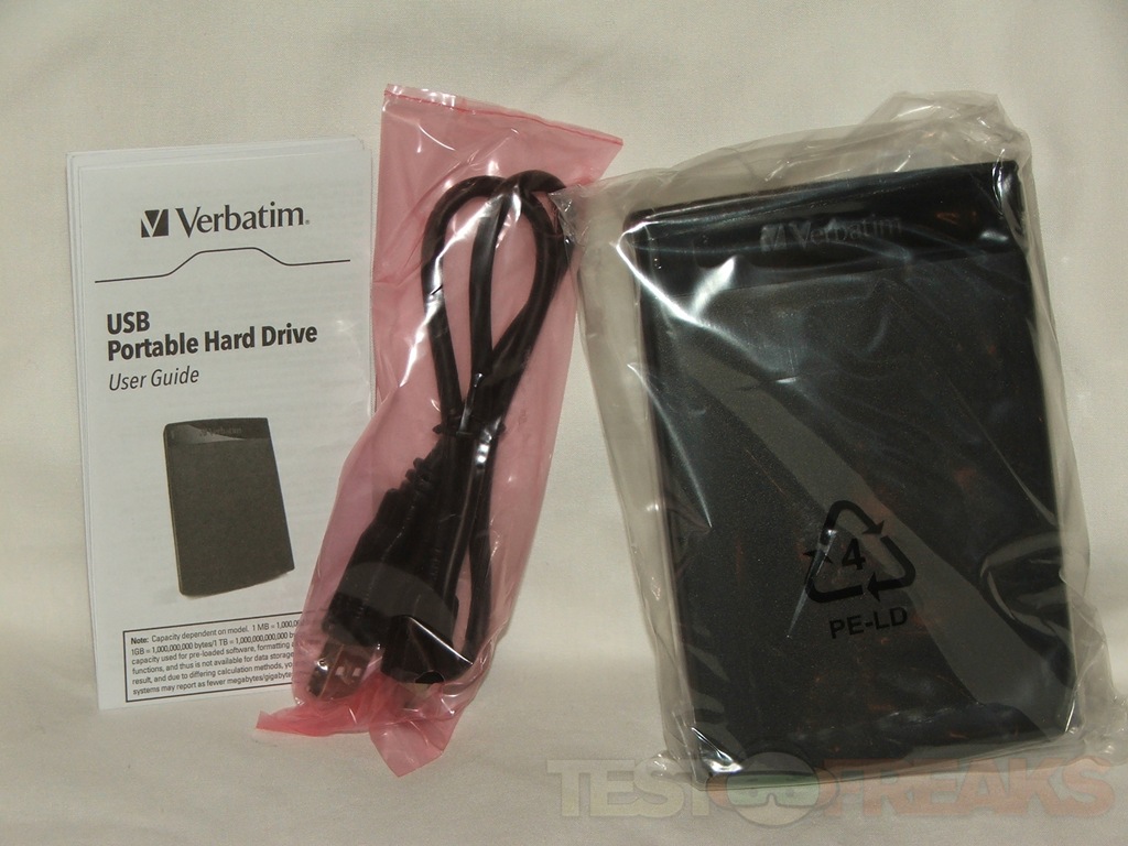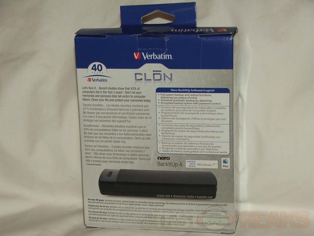 The Verbatim CL?N drive comes in two boxes actually, the outside box has the information printed on it, and the inside box houses the drive and the USB cable along with the user manual.