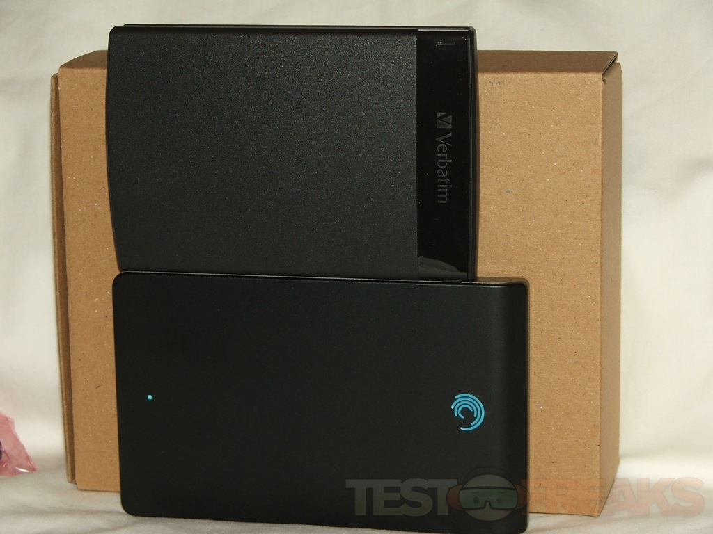 Here’s some comparison shots of the Verbatim and Seagate drives to show you the size difference, I thought the BlackArmor was small, but the Verbatim is much smaller overall.