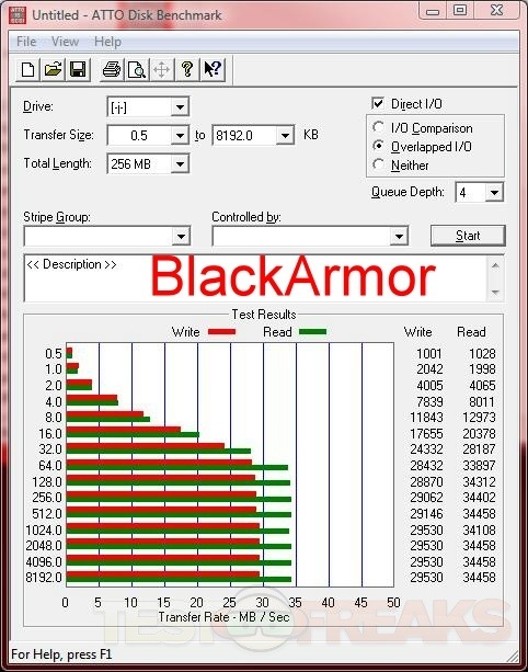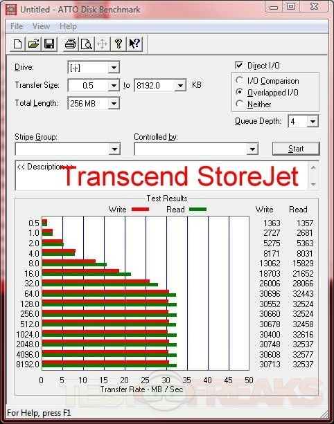 For testing I started out with ATTO Diskbenchmark and found the Verbatim drive is rather fast.