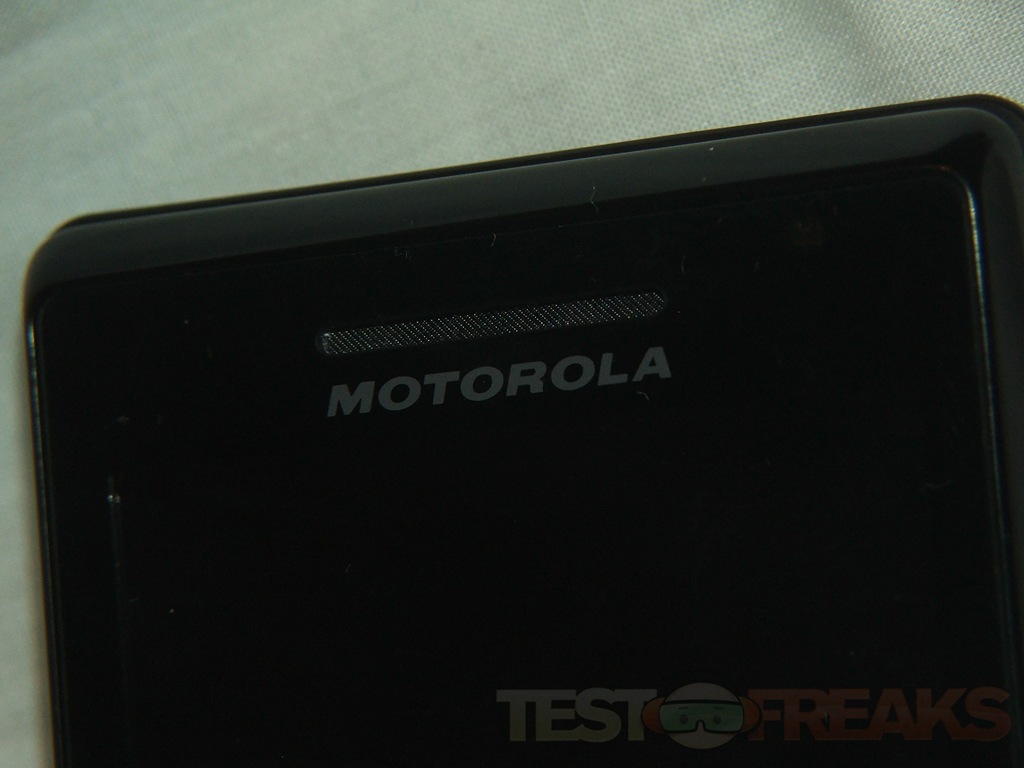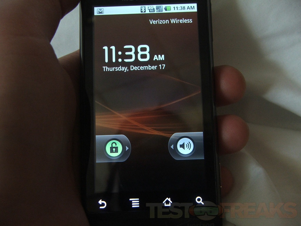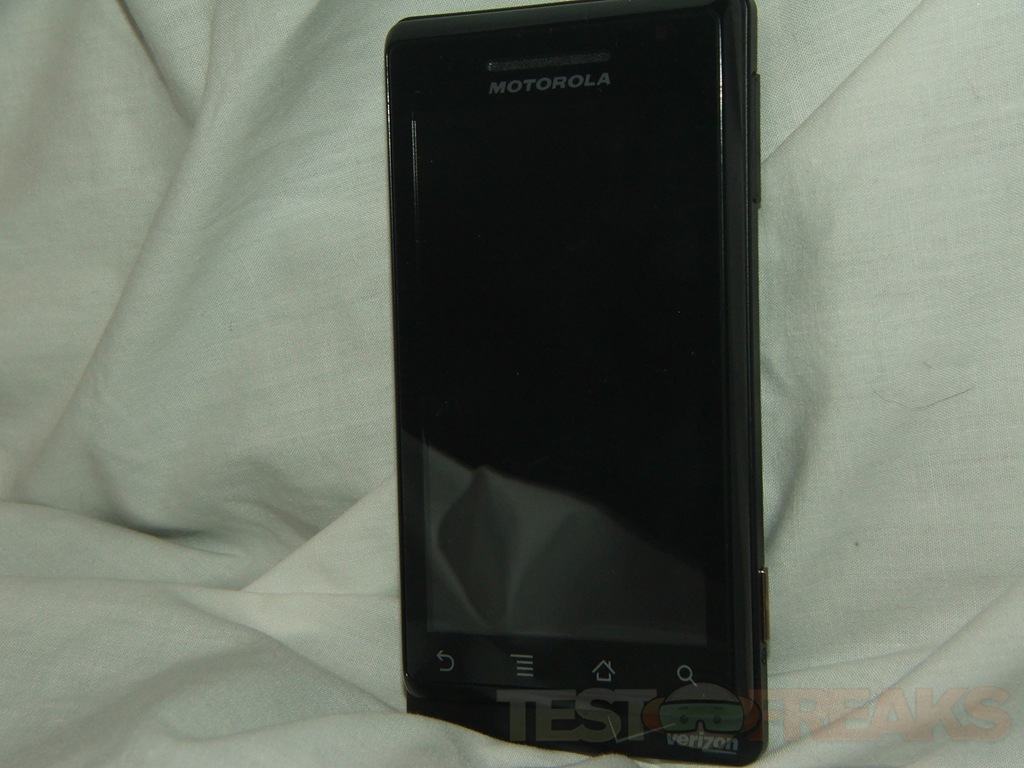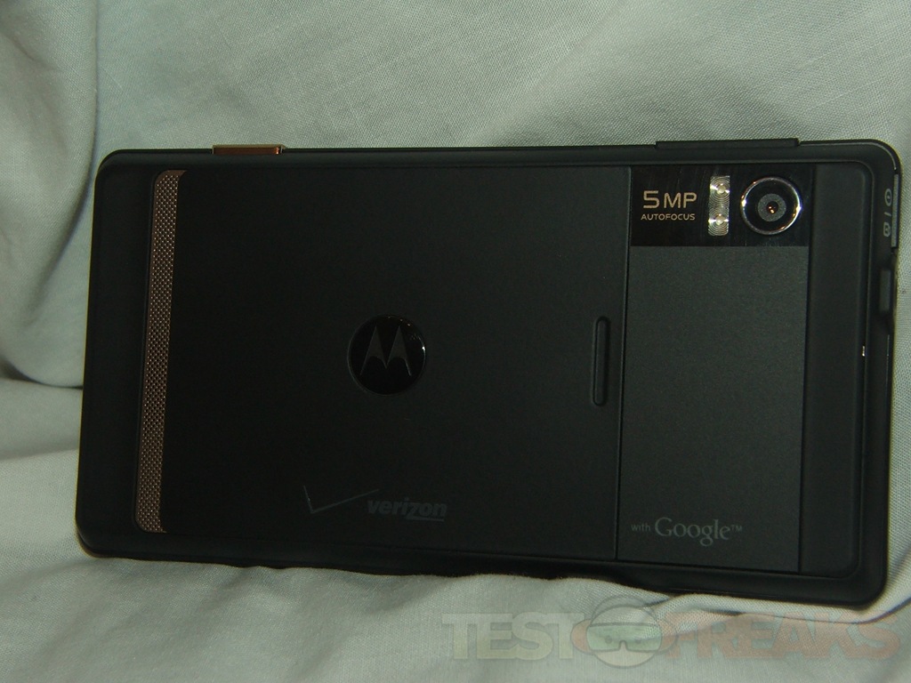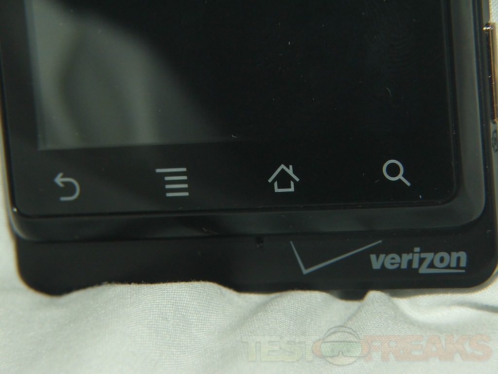 The Droid is primarily all black with just some gold accents on the back and the camera button is gold as well. The Motorola logo is on the top and at the bottom you’ll find four buttons, beneath those is the Verizon logo.