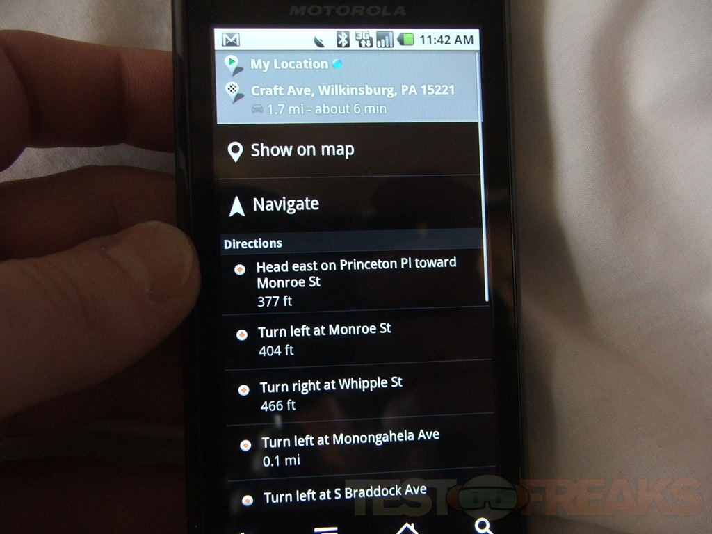 Google maps comes with the Droid and it does do basic navigation. It’s not like having TomTom on your phone like my Tilt does, but in a pinch it works for quick directions. GPS fix is fast and accurate.