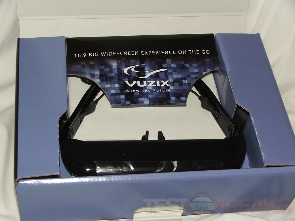 The box for the Vuzix AV310 is a box with information on it about the product, opening it up we find sort of a display with the AV310 sitting there.