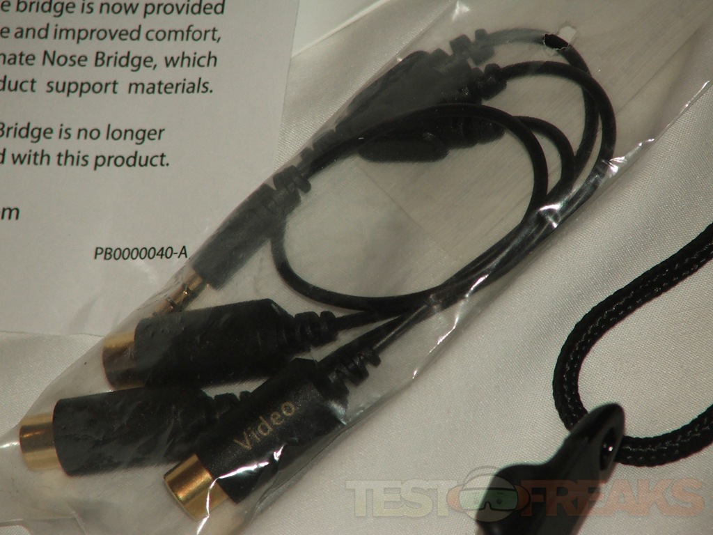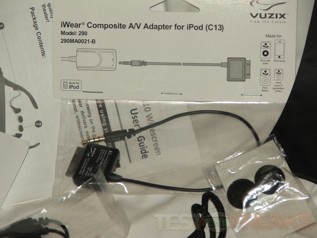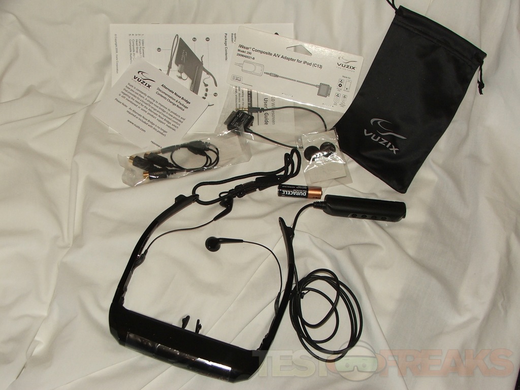 There are a few things that come with the Vuzix AV310 Widescreen Video Eyewear, including the iPod cable, standard A/V cable, foam covers for the earbuds, a carrying bag, battery, strap and the user manual, along with other documentation.