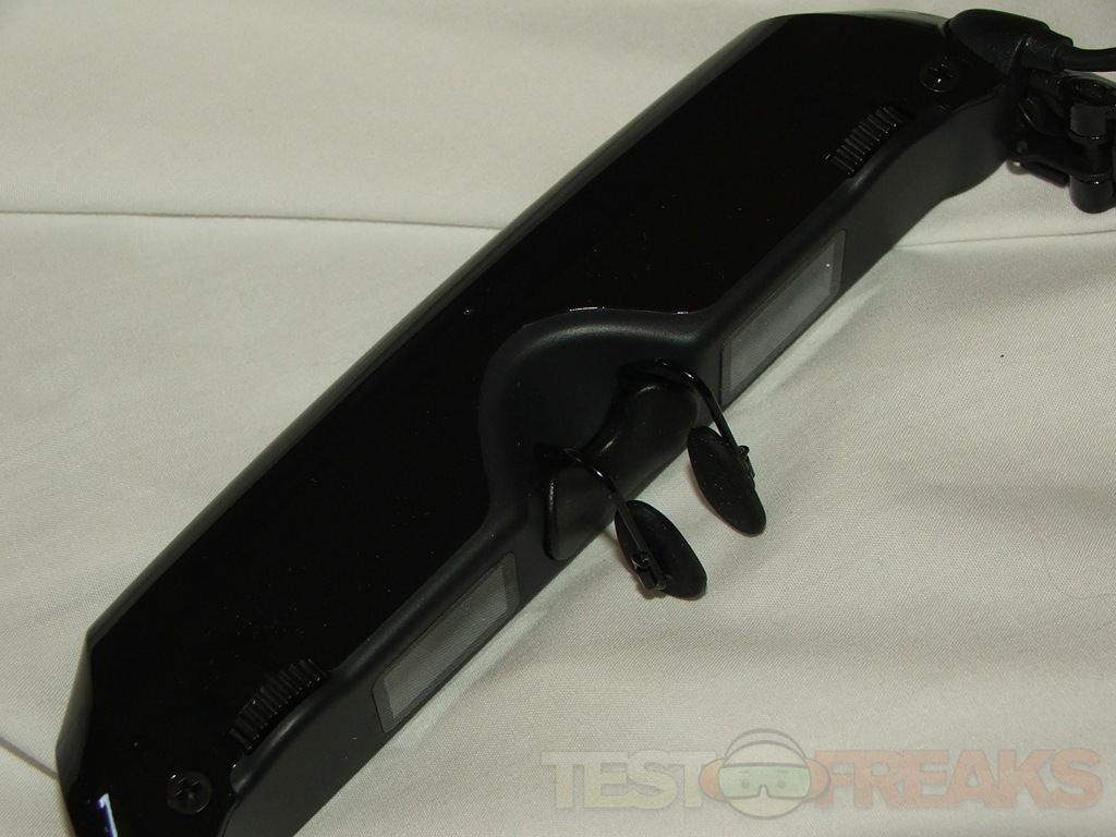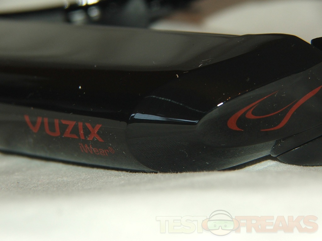 Vuzix products sort of remind me of Geordi La Forge from Star Trek:TNG, the visor that he wears to help him see. The AV310 is basically a large black, stylish looking piece of plastic that houses two miniature LCD monitors. The only markings on it are the Vuzix logo on the front and sort of a tribal style marking on the side done in a dark red so they’re actually not that noticeable.